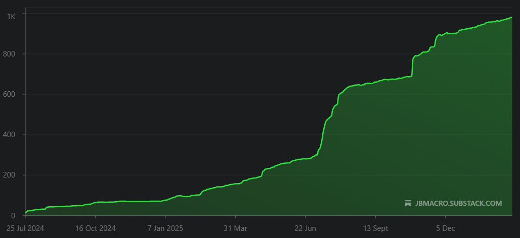 But for now, I want to say thank you to my subscribers, all 981 of you. Some of you have been here from the get go in July 2024, and others are newer.