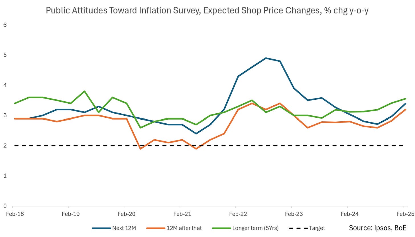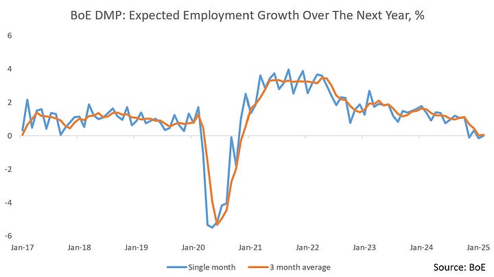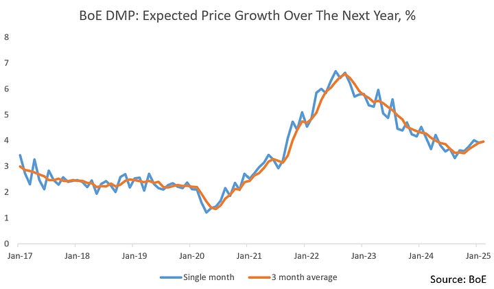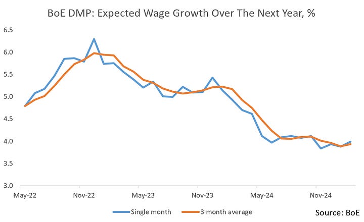 The first key survey data we got in this regard was the Bank’s 2025 Agents’ Annual Pay Survey, with surveys taken over Nov/Dec 2024. This showed expectations of pay growth settlements at 3.7% in 2025. This importantly is down from actual settlements of 5.3% in 2024 (Agents’ estimate for 2024 at the end of 2023 was 5.4% - they’re quite good forecasters).