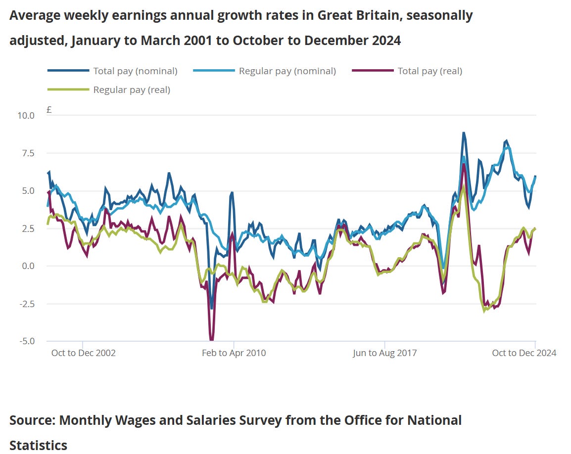 Following some upside surprises in the AWE total pay growth into late 2024 (wage gains at 6.0% y-o-y in December, chart below from the ONS), survey data into early 2025 gives a crucial read on whether this is an unwelcome trend of even more stubborn wage growth than we currently have.