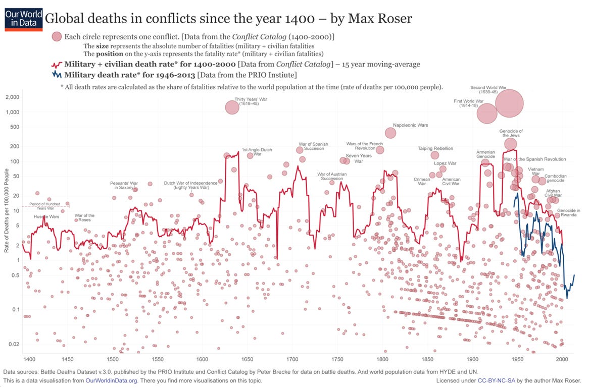 The world hasn’t been so nice for almost 20 years now. This isn’t me needlessly complaining (although I do enjoy doing so), and it isn’t me talking about all of the death and destruction in the world. In fact, despite a recent uptick, the world is in a period of unprecedented peace with deaths in conflict per capita still well below historic lows.